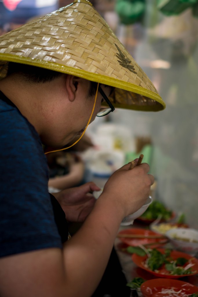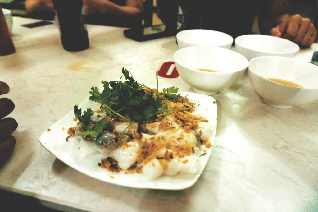 I did eventually get my bánh cuốn fix, our group making our way over to Bánh Cuốn Gia Truyen the following evening. Their principal dish did not disappoint: the thick gooey rice noodle filled with the savory pork and umami bounce of the mushrooms, juxtaposed with the crunch of the other veggies was an intriguing combination of flavors and textures, elegantly finished off with the zest of the fresh herbs and crisp fried shallots. The group was grateful for my persistence in tracking down this delicious and strange delicacy, with one round not enough to satiate the four of us.