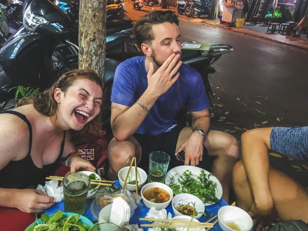 I suppose one of my favorite things about traveling is sometimes not being entirely sure what it is that you’re consuming, part of the spontaneity that’s inherent to adventure.  A woman touted glasses of light beers on a tray like at a baseball game, and all of us grabbed a chilly mug as a plate of golden golden spring rolls arrived with the ubiquitous side plate of greens and fish sauce.