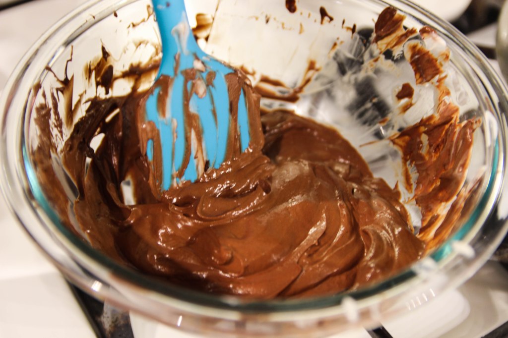 4. Remove whipped cream from fridge and gently fold half of the whipped cream into the chocolate mixture.