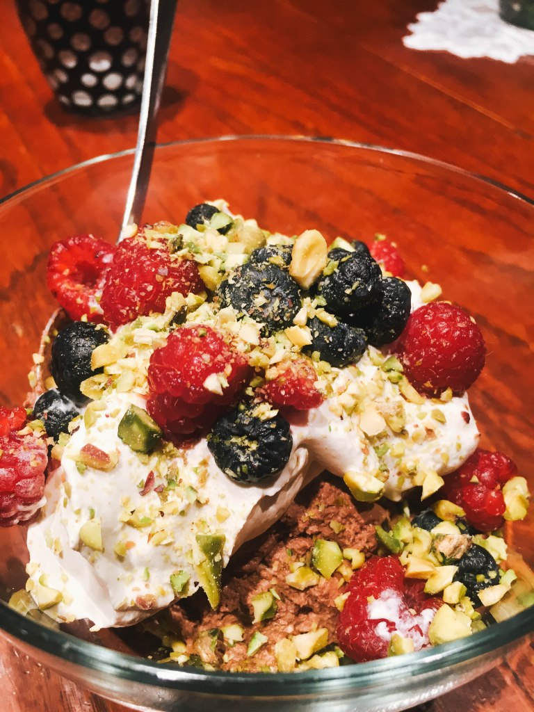 5. Portion chocolate mousse into serving dishes if you’d like, and let set in fridge for a little to get that perfect consistency, at least 15-30 minutes. When ready to serve, top with a pinch of salt, whipped cream, and whatever your choice of sweet garnish. (We topped ours with chopped pistachios, blueberries and raspberries, and it was amazing.)